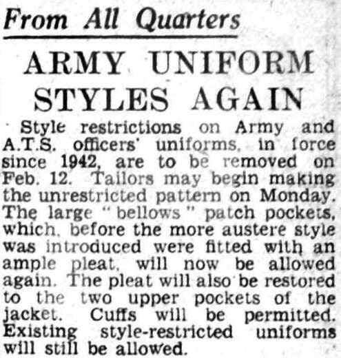 The end of WWII also saw fashions changing, as regulations were dropped. Peacetime marked the return of older ways of styling which were practised prior to WWII but got banned during the war. For instance this article highlights the lift on the ban of the ‘large bellows patch pockets’ with ample pleats on Amy and A.T.S. officers’ uniforms, which during the war were forbidden and replaced by the introduction of a more ‘austere style’. This reiterates the idea that fashion trends are repetitive and cyclical.