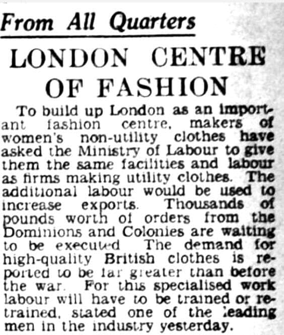 As the increase in female non-workwear occurred globally after WWII so did the supply and demand for high-end fashion clothing. This shows that London became the high-end fashion hub which tasked itself with meeting the demand to manufacture non-utility clothing for women globally. This meant that there was a rise in the need for skilled designers and that the economy would grow rapidly due to fashion item exports during this time. Thus the fashion industry in this region experienced quite significant growth after the Second World War, evident in many of the sources in The Telegraph Historical Archive.